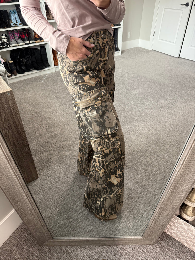 I cannot say enough about this pant. It has 4 cargo pockets, 2 main pockets and 2 pockets on the backside. It is a thick, yet soft jean material. An all around quality pant. Its true to size and kyygirl is wearing a large.